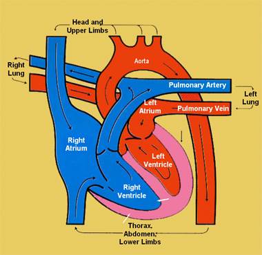 The heart is divided by muscle into left and right sides, each side has two chambers, the atrium (upper) and the ventricle (lower). Valves between the chambers allow a single-direction blood flow. This allows oxygenated blood supply to the whole body via the aorta.