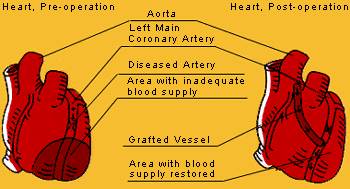 Commonly known as "CABBAGE". Open heart surgery using leg veins to bypass the obstruction and restore the blood supply to the heart. |