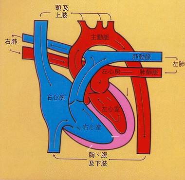 心 臟 分 為 左 右 兩 邊 由 心 肌 完 全 分 隔 , 每 邊 分 為 兩 腔 , 心 房 在 上 , 心 室 在 下 , 心 房 與 心 室 之 通 道 間 有 心 瓣 , 有 活 瓣 作 用 , 使 血 液 單 向 運 行 , 氧 化 的 血 液 經 主 動 脈 輸 出 , 供 給 全 身 的 各 部 位 。